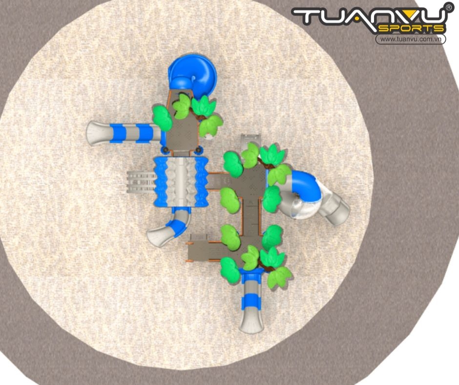 Cầu trượt xoay, có tay vịn ở cả hai bên cầu trượt và bệ trên cùng để tăng cường an toàn. Lên một tầng, có cầu trượt xoắn ốc và cầu trượt thẳng, nơi trẻ em có thể thi đấu với bạn bè.