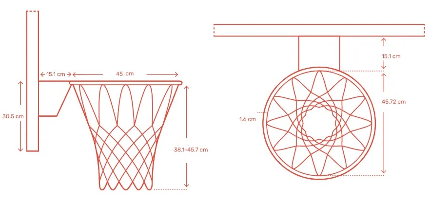 Đường kính của vành bóng rổ vào khoảng 45cm. Trong đó, chiều dài của lưới bóng dao động từ 31,8cm đến 45,7cm. Phần vành bóng rổ được lắp chìa ra bên ngoài cách bảng bóng rổ 15,1cm.