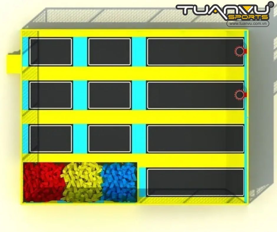 Ngay khi bước vào công viên trampoline, điều đầu tiên bạn sẽ thấy là rất nhiều tấm bạt lò xo. Trẻ em có thể thoải mái nhún nhảy trên các tấm bạt lò xo để trải nghiệm cảm giác không trọng lực. Chúng cũng có thể nhảy và nhào lộn tùy thích trong khi chơi để rèn luyện kỹ năng của mình.