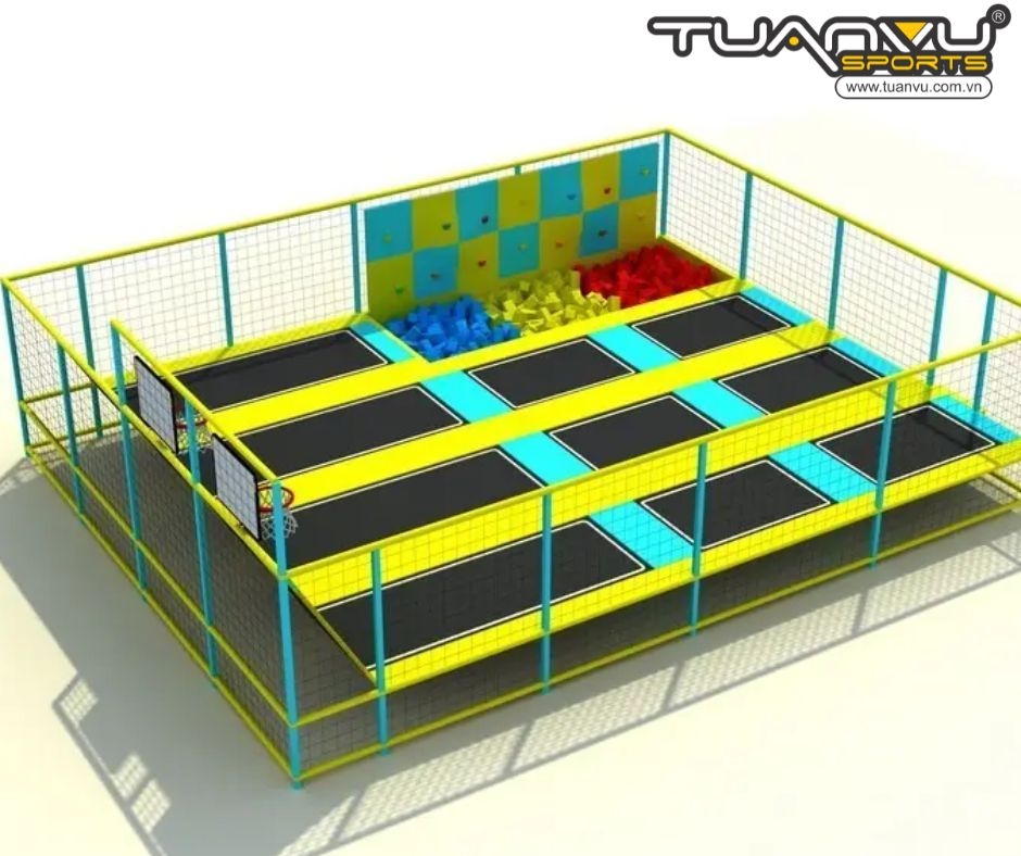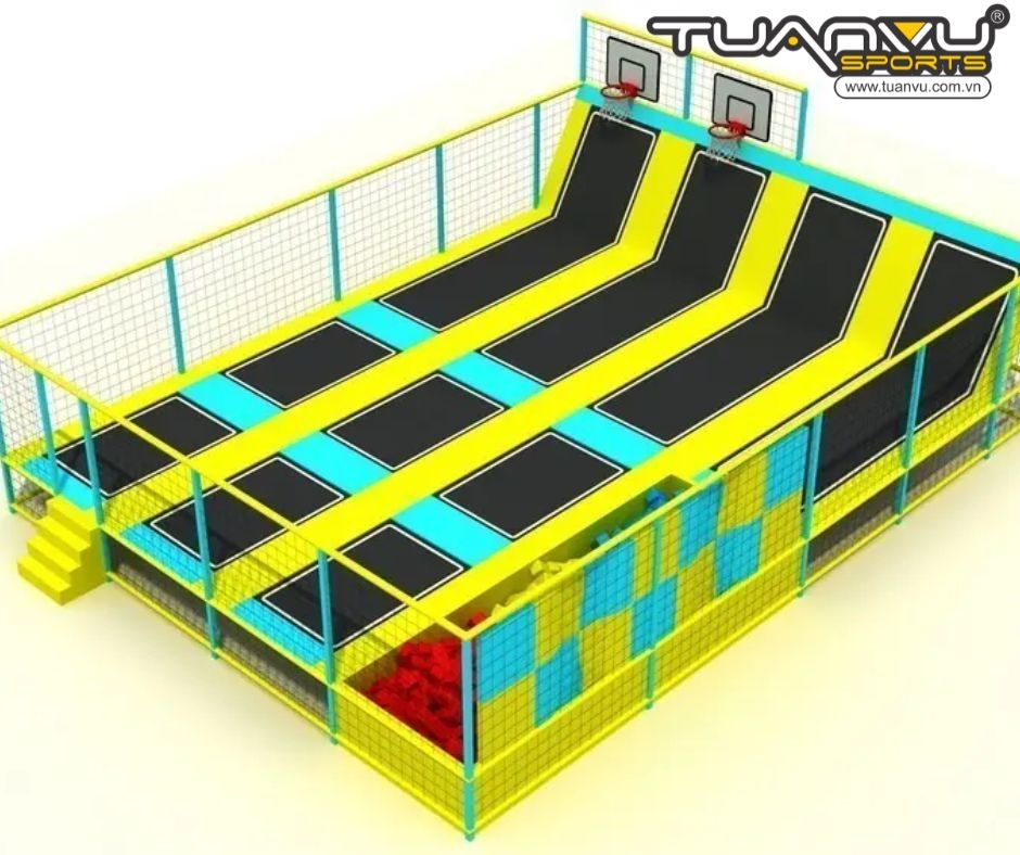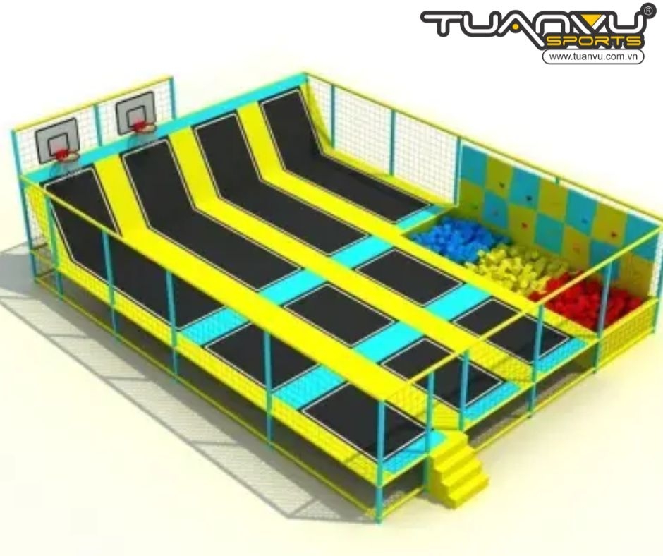 Bên trái còn có một tấm bạt nhún hình chữ L, và trên tấm bạt nhún có một khung bóng. Người chơi có thể sử dụng kỹ năng của mình để bật lên khung bóng và ném bóng vào khung bóng. Bạn không chỉ có thể rèn luyện kỹ năng mà còn có thể rèn luyện khả năng nhảy của mình.