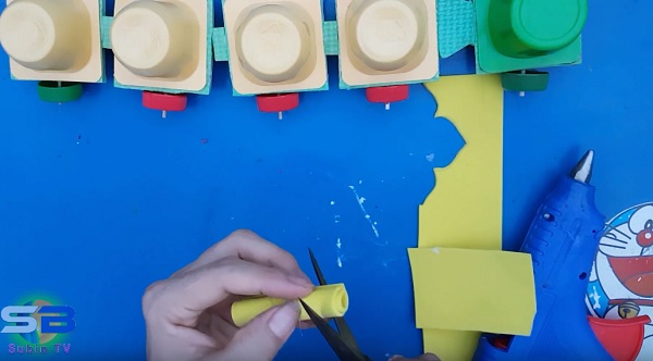 Chuẩn bị: 5 vỏ hộp sữa chua sạch sẽ và khô ráo, giấy màu, keo, 8 miếng mút xốp tròn nhỏ, 1 miếng bìa cứng dài hình chữ nhật.