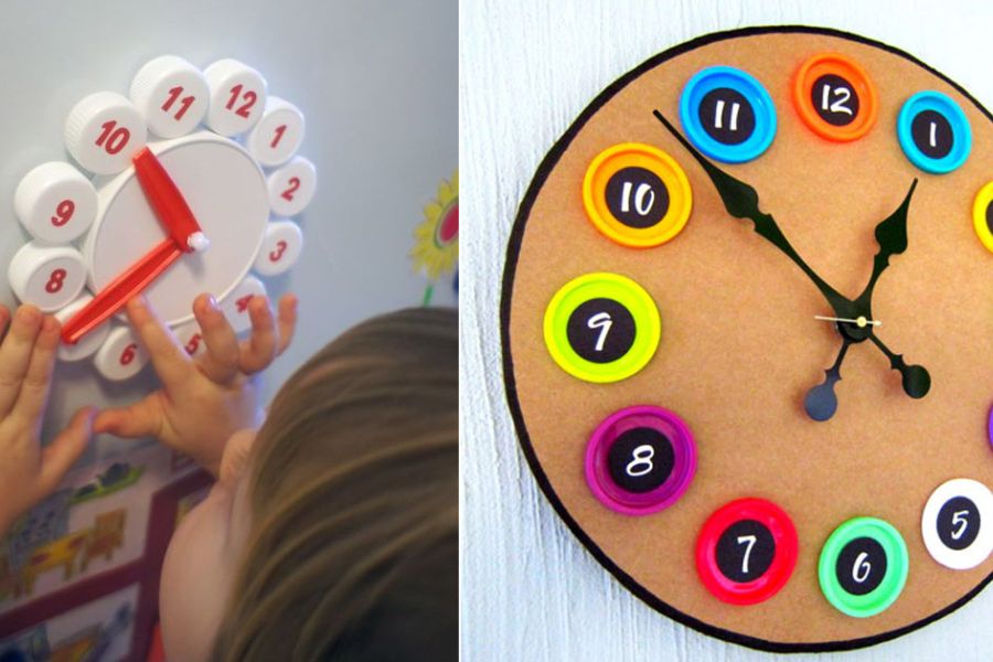 Với các nắp nhựa từ chai phế liệu, cha mẹ có thể tạo ra đồ dùng đồ chơi tự làm cho trẻ mầm non vô cùng thú vị. Ví dụ như sản phẩm đồng hồ với cách làm gồm các bước: