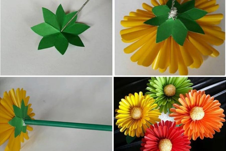 - Bước 4: Gắn thân cây và lá cây bằng ống hút màu xanh.