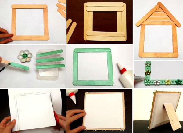 - Bước 4: Gắn lên mỗi cạnh tấm bìa 2 que kem, tạo hình khung ảnh.