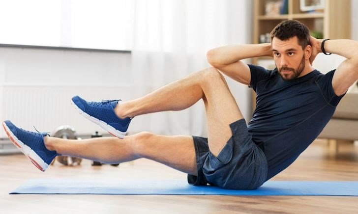 Nằm ngửa trên sàn, đặt tay phải qua sau gáy và tay trái đặt trên bụng. Nâng đầu gối vuông góc với mặt sàn. Từ từ nâng đầu và vai lên khỏi mặt sàn, sau đó xoay người sang bên phải để khuỷu tay trái chạm vào đầu gối phải. Giữ nguyên tư thế trong 3 giây rồi trở lại vị trí ban đầu. Tiếp tục thực hiện với bên còn lại. Lặp lại động tác trong 3 hiệp, mỗi hiệp 12-15 lần.