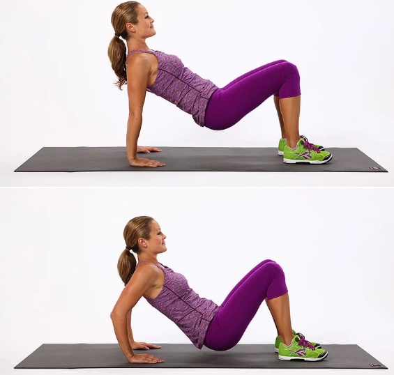 Bài tập giúp nâng cơ, giảm mỡ vùng bắp tay vô cùng hiệu quả. Bạn cần thả lỏng chân trên sàn, chống 2 tay ra sau lưng. Nhấc người lên bằng lực cánh tay sao cho 2 tay duỗi thẳng. Thực hiện 3 hiệp với tần suất 10 – 15 lần/hiệp.