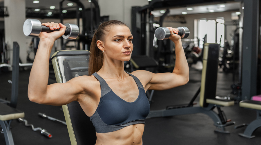 - Shoulder press: Bài tập thực hiện đứng hoặc ngồi và nâng 1 thanh đòn lên trên đầu, tiến hành tập 3 hiệp, mỗi hiệp lặp lại 8 – 12 lần.