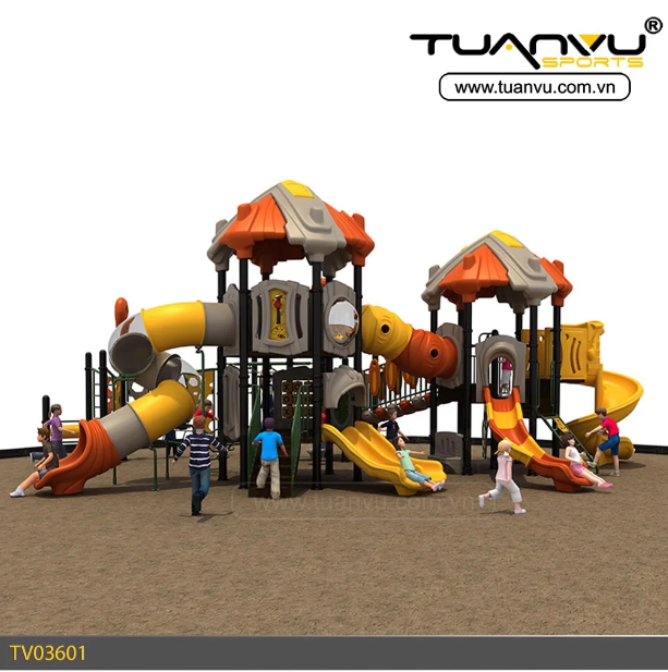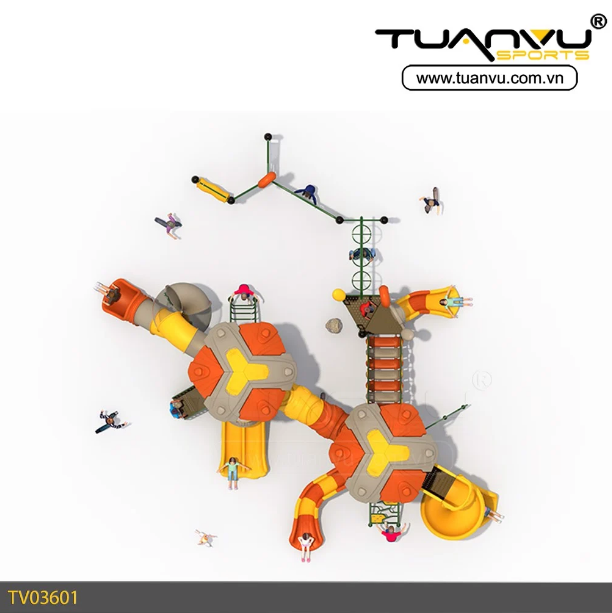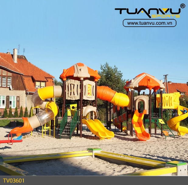 - Sân chơi mầm non TV03601 có diện tích rộng, thiết kế ống trụ dài, và nhiều cầu trượt tạo ra không gian chơi cho nhiều bé cùng lúc.