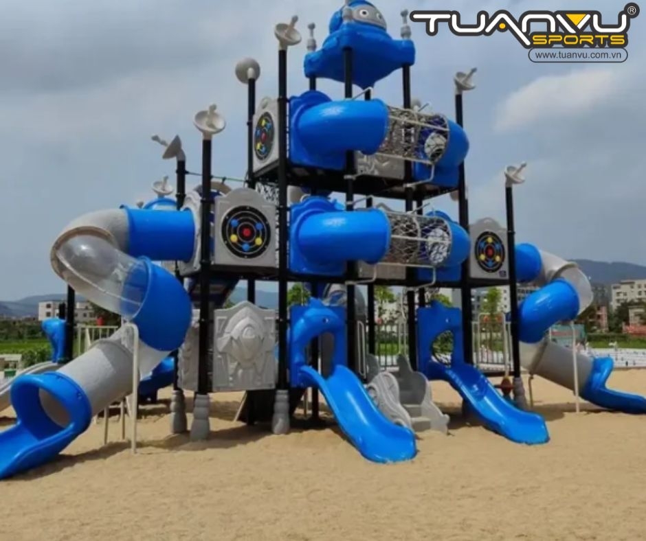 Đây là một sân chơi cầu trượt bằng nhựa cỡ lớn. Màu chủ đạo là màu xanh dương. Đây là một khu vui chơi ba tầng với cầu trượt và đường hầm chui cho trẻ em chơi, mang lại nhiều niềm vui.