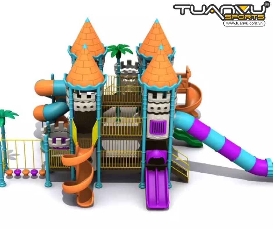 Lâu đài nhỏ bên trái có cầu trượt xoắn ốc mở, và có đường dẫn an toàn để trẻ em có đủ không gian điều chỉnh tư thế trượt.