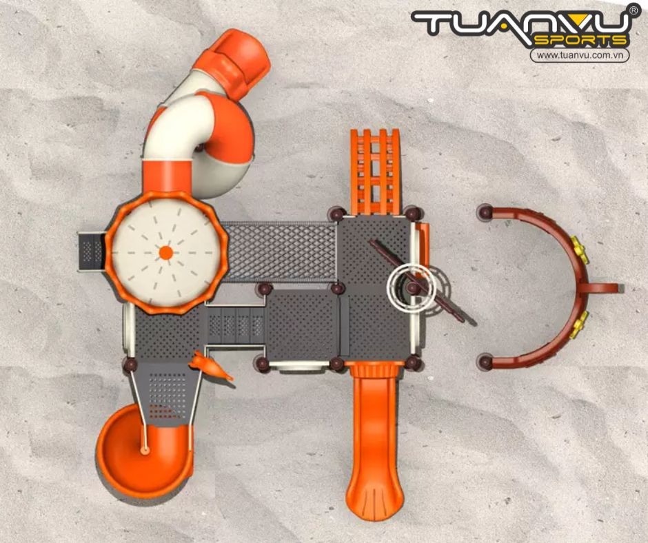 Đầu tiên, hãy đi về phía bên trái, có một khu leo trèo màu cam, nơi trẻ em có thể sử dụng để rèn luyện khả năng leo trèo và phối hợp tay chân.