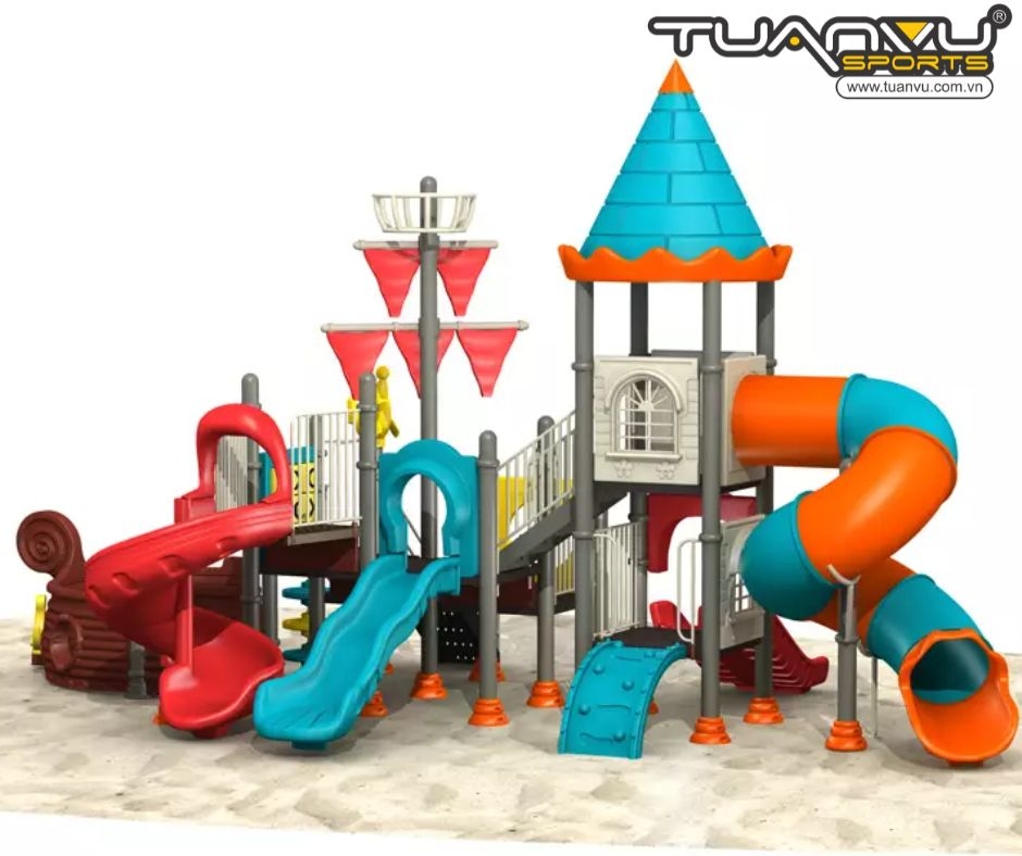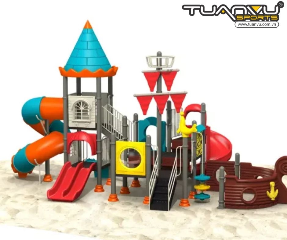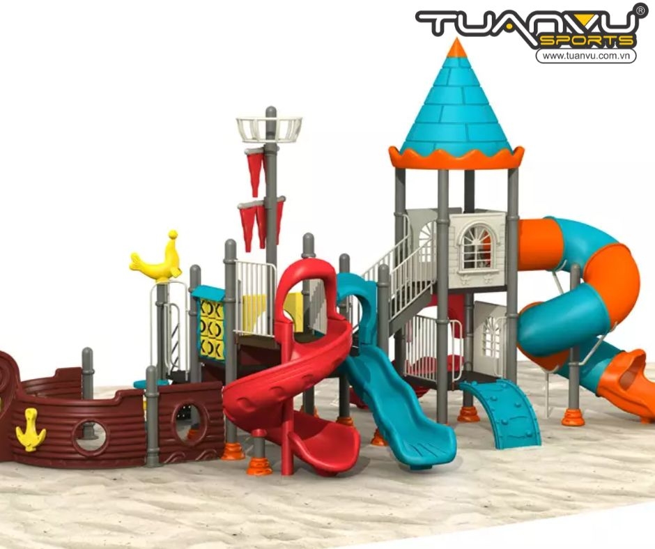 Bộ đồ chơi sân chơi ngoài trời hình tàu cướp biển này có điểm nổi bật nhất là nhiều cầu trượt với độ cao khác nhau để trẻ em lựa chọn.