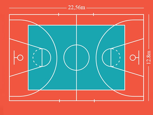 Kích thước sân bóng rổ phù hợp với học sinh tiểu học là 22,56m x 12,8m. Trong khi đó, kích thước bảng rổ là 1,524 x 0,914m và kích thước chân trụ 0,125 x 0,125m.